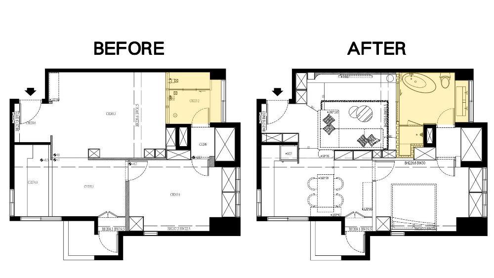 經過與設計師的深入溝通,夫妻倆希望在居住空間中充滿儀式感,設計師大膽提議,將原本客廳與浴室之間的隔牆拆除,改變衛浴入口方向,打通空間,引入自然光線和清新空氣,成功打破了原有空間的界定,解決了光線不足和動線不順暢的雙重困擾。